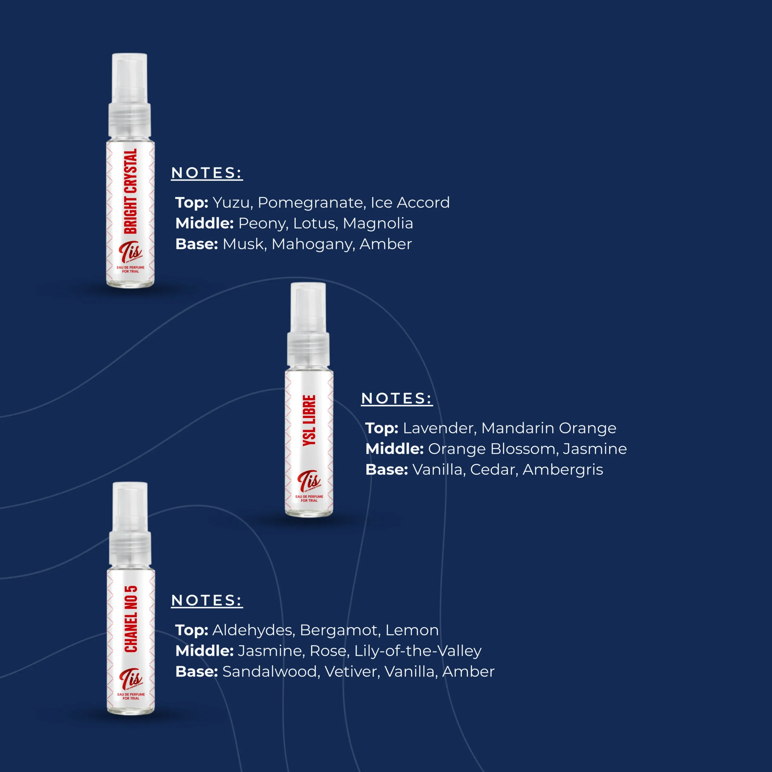 Top Notes: Aldehydes, ylang-ylang, neroli, bergamot, lemon